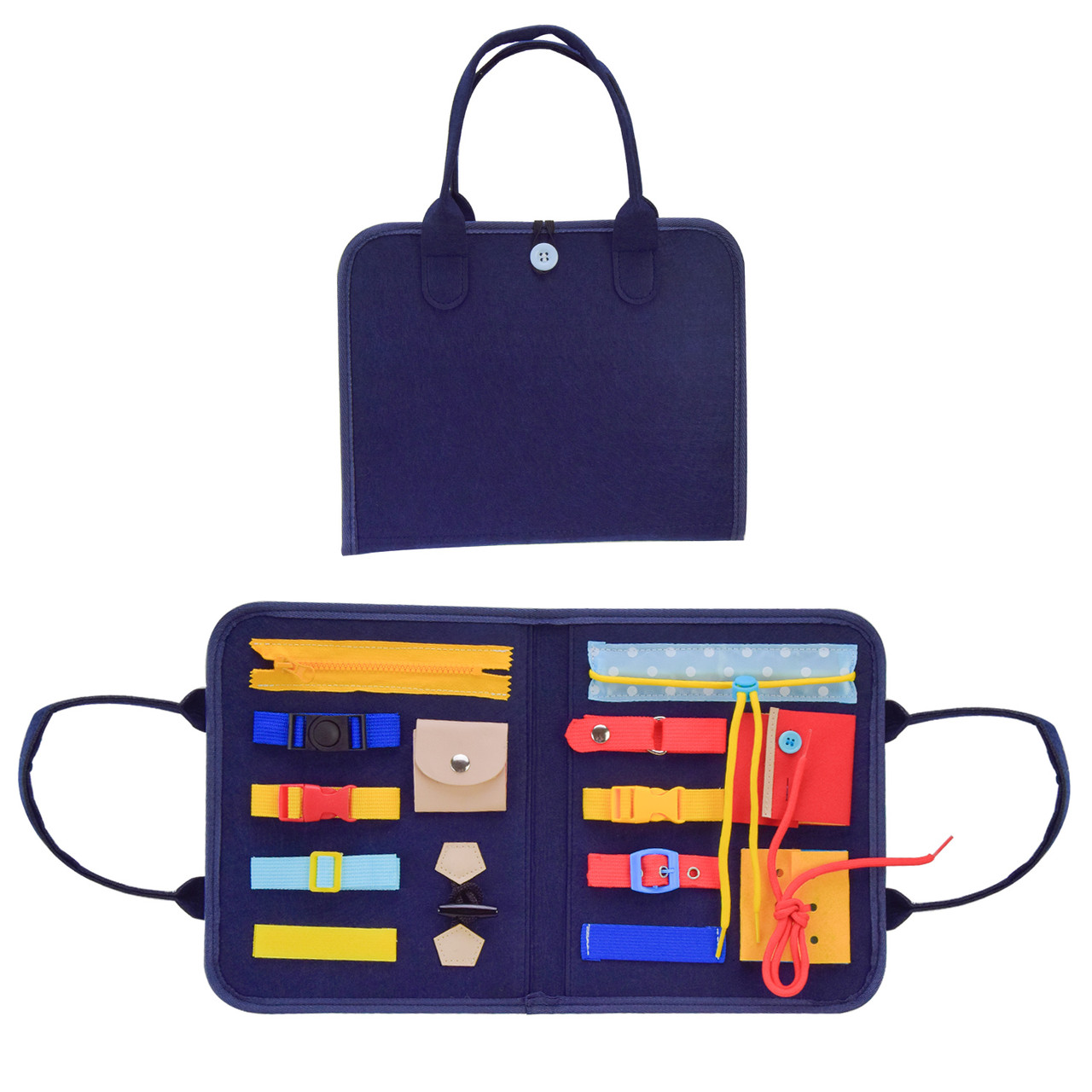 Навчальна бізисумка з фетру "Застібки" — це розвивальна іграшка, що сприяє розвитку дрібної моторики та координації рухів у дітей. Усередині сумки розташовані різноманітні застібки: змійка, ґудзики, кнопки, ремінець, липучки, фастакс. Кожен елемент дає змогу дитині тренуватися в застібанні та розстібанні, що допомагає розвивати логіку та самостійність.